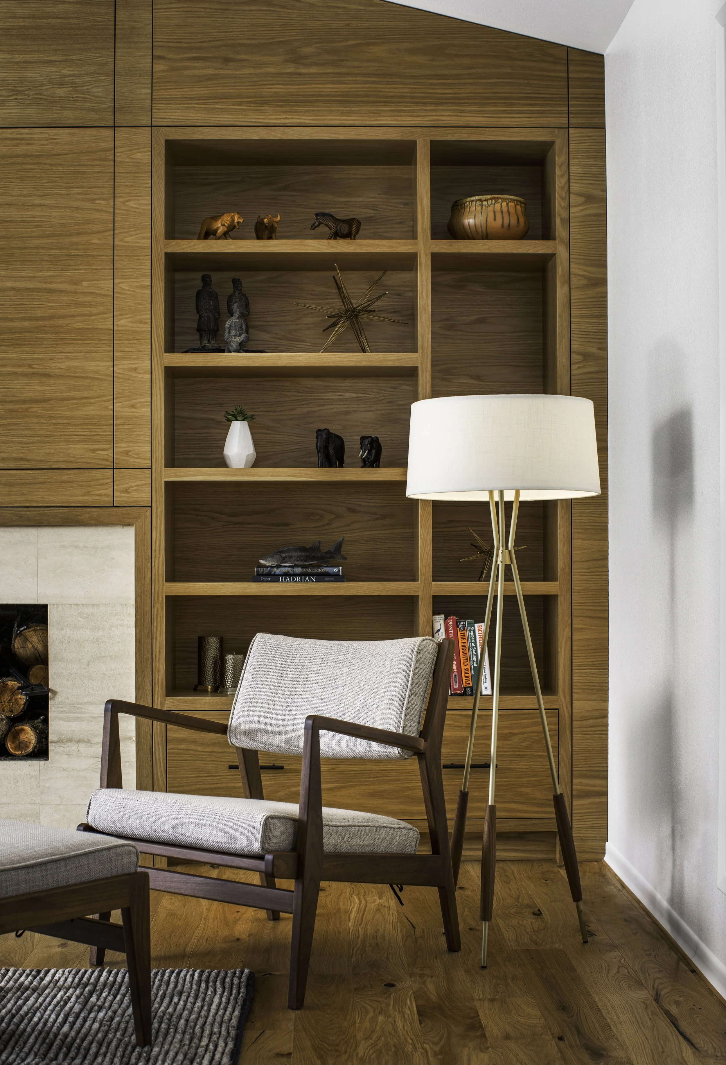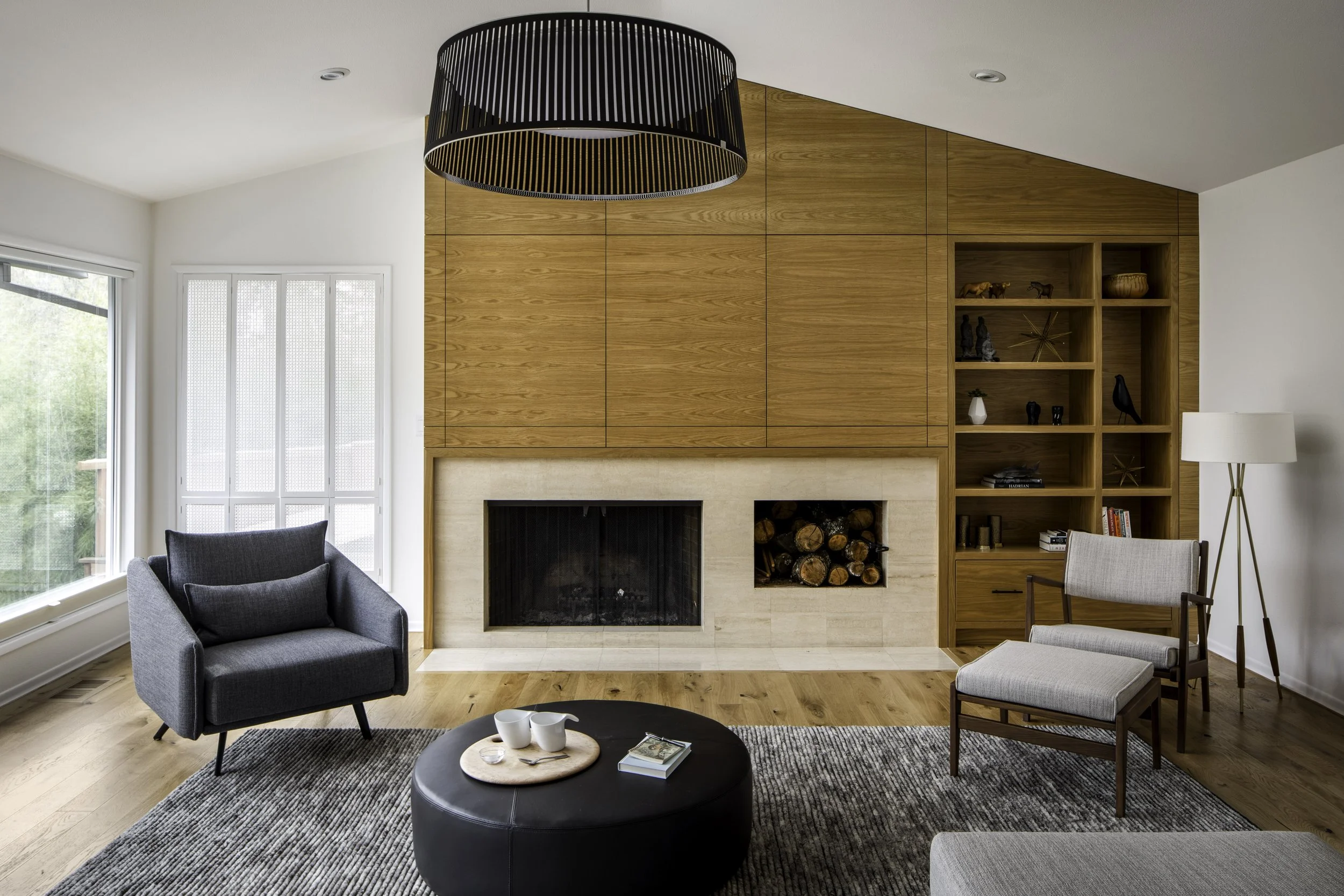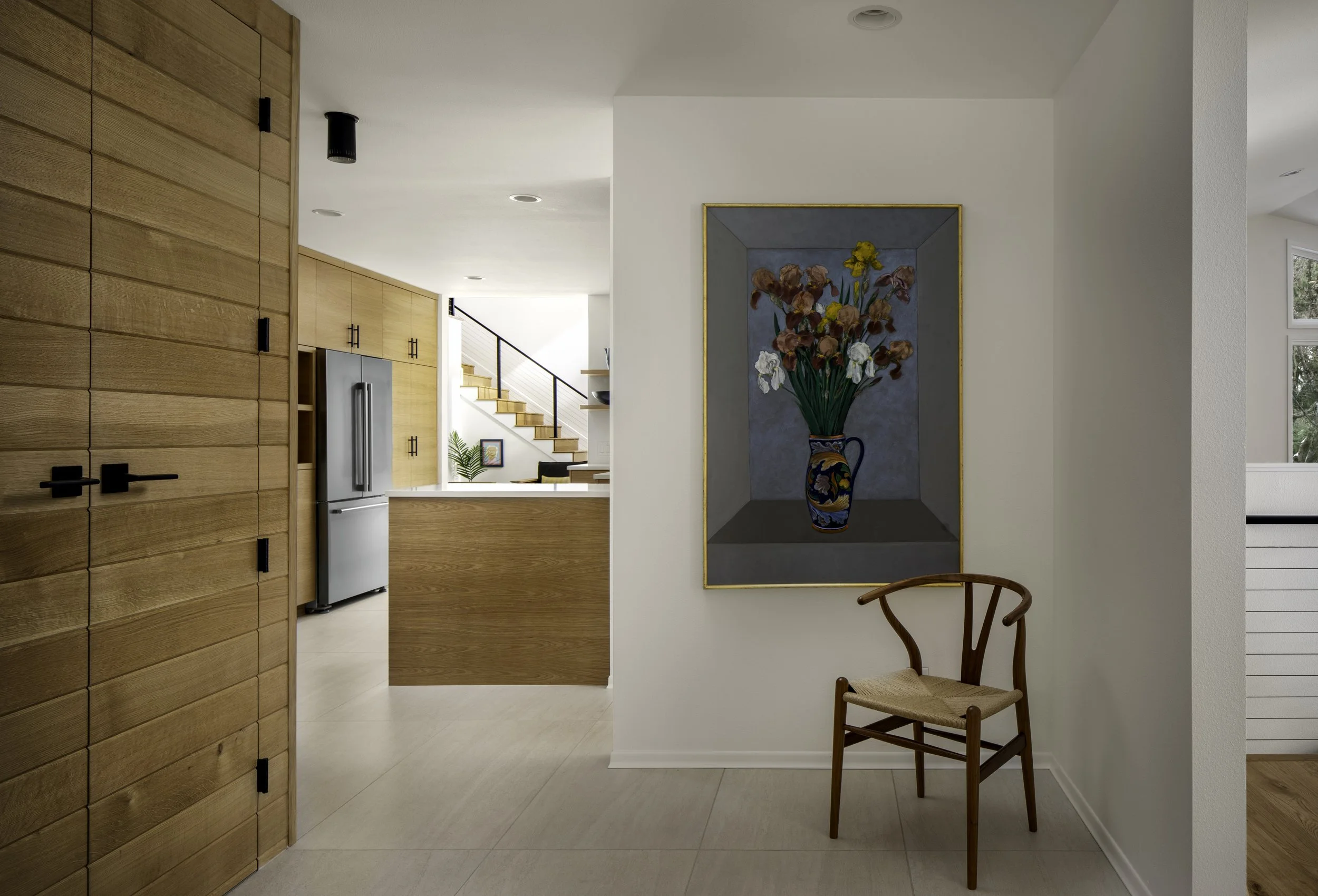 The design opens up the kitchen, redefines the entry, and integrates new paneling around the existing fireplace stone surround. A mezzanine office and indoor/outdoor sunroom expand livability, while added window openings flood the home with natural light. Strategically placed gallery walls showcase the homeowners' art collection from multiple vantage points.