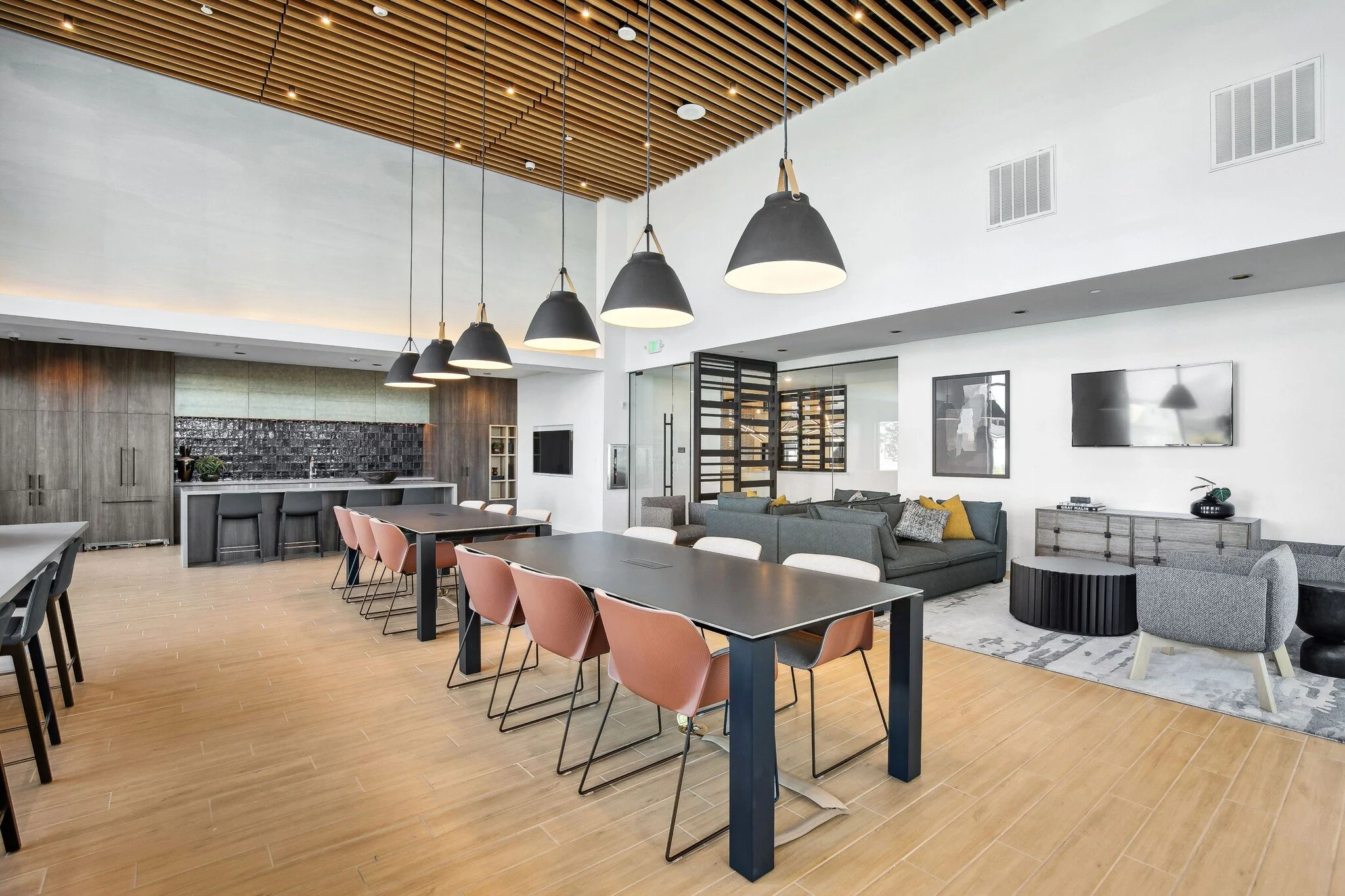 A mix of warm wood tones and a soft, neutral palette provides a versatile backdrop, allowing furniture and art to introduce pops of color. Custom screens thoughtfully divide spaces while maintaining sight lines, creating a sense of openness and connection. Whether through a screen or glass, nearly every amenity space remains visually linked, enhancing flow and interaction.